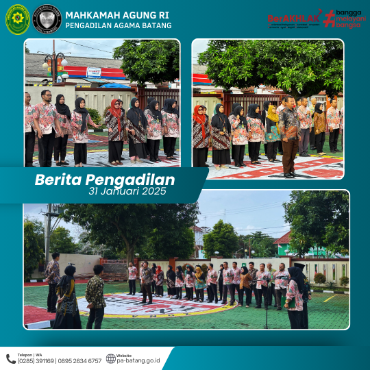 BATANG, Jumat, 31 Januari 2025 – Segenap Pimpinan, Hakim, Pejabat Struktural dan Fungsional, Staf, serta PPNPN Pengadilan Agama Batang melaksanakan Apel Jumat sore di halaman kantor Pengadilan Agama Batang sebagai penutup setelah menyelesaikan rutinitas pekerjaan kantor di penghujung bulan Januari 2025.