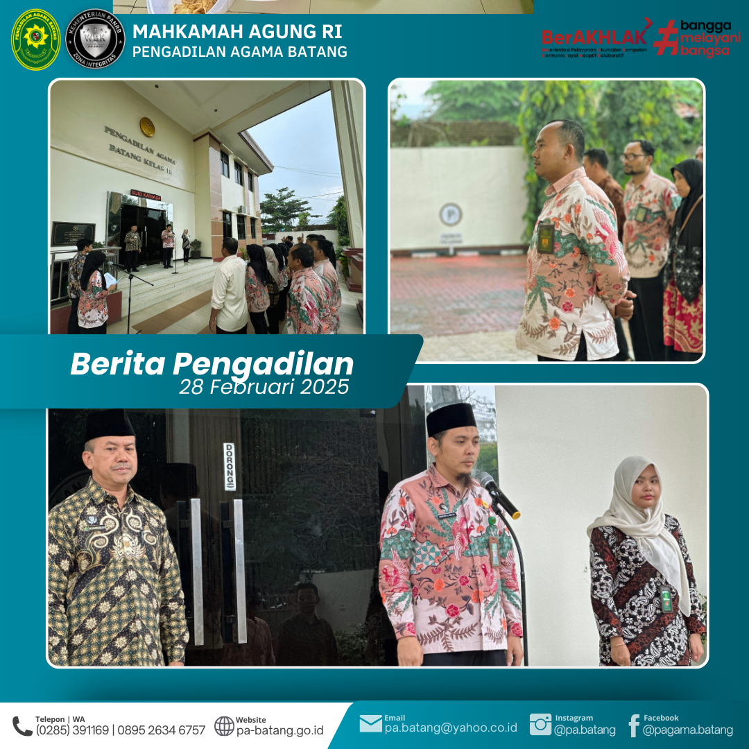 Batang – Menjelang datangnya bulan suci Ramadhan 1446 H, Pengadilan Agama Batang menggelar Apel Jumat Sore pada Jumat, 28 Februari 2025, pukul 16.00 WIB, bertempat di halaman kantor PA Batang. Apel ini merupakan apel terakhir sebelum memasuki bulan Ramadhan dan diikuti oleh seluruh aparatur PA Batang.