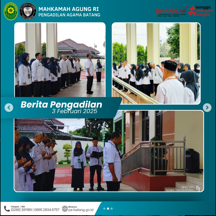BATANG, Senin, 3 Februari 2025 – Segenap Pimpinan, Hakim, Pejabat Struktural dan Fungsional, Staf, serta PPNPN Pengadilan Agama Batang melaksanakan Apel Senin pagi di lobi kantor Pengadilan Agama Batang, sebagai pembuka rutinitas pekerjaan kantor untuk sepekan ke depan. Kegiatan ini dimulai tepat pukul 08.00 WIB.