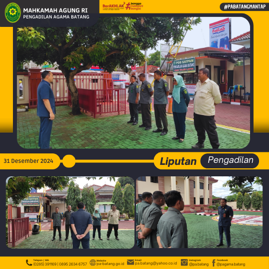 Batang, Selasa pagi, 31 Desember 2024, pukul 08.00 WIB, Pegawai Pemerintah Non Pegawai Negeri (PPNPN) Pengadilan Agama Batang mengikuti briefing terakhir tahun ini. Kegiatan berlangsung di halaman Kantor Pengadilan Agama Batang dan dipimpin langsung oleh Sekretaris Pengadilan Agama Batang, Yth. Widodo Arif Wicaksono, S.Kom., S.H.