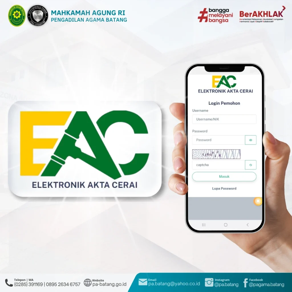 Aplikasi EAC adalah aplikasi yang digunakan untuk memproses penerbitan salinan putusan/penetapan dan akta cerai secara elektronik yang merupakan bagian tidak terpisahkan dari SIPP. Adapun salinan putusan yang diproses pada aplikasi EAC ini adalah salinan putusan dengan perkara non e-Court. Aplikasi EAC diharapkan mampu meningkatkan pelayanan dalam fungsinya pengambilan produk hukum yang diantaranya terdapat salinan putusan/penetapan dan akta cerai di Pengadilan Agama secara online dimana masyarakat akan menghemat waktu dan biaya saat melakukan pengambilan produk hukum.