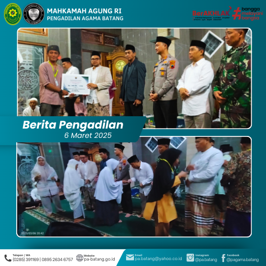 Batang, Kamis 6 Maret 2025 β Ketua Pengadilan Agama (PA) Batang, Ikin, S.Ag., menghadiri Putaran Pertama Tarawih Ukhuwah (Tarling) Pemerintah Kabupaten Batang dalam rangka bulan suci Ramadhan 1446 H/2025 M. Acara yang berlangsung di Masjid Baitul Muttaqin, Sukomangli, Reban, Batang ini menjadi momentum untuk mempererat ukhuwah Islamiyah dan membangun kebersamaan antara pemerintah dan masyarakat.