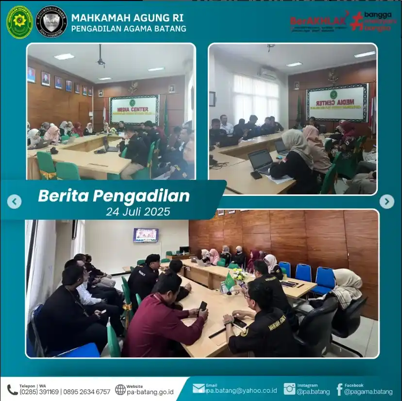 BATANG – Kamis, 24 Juli 2025 | Dalam rangka memperkuat integritas dan akuntabilitas di lingkungan peradilan agama, seluruh Pimpinan, Hakim, dan Aparatur Pengadilan Agama Batang mengikuti kegiatan Pembinaan Kode Etik Hakim & ASN serta Evaluasi Sistem Akuntabilitas Kinerja Instansi Pemerintah (SAKIP).