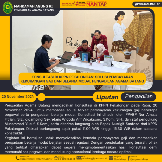 Pekalongan, Rabu, 20 November 2024 – Pengadilan Agama Batang melaksanakan kegiatan konsultasi di Kantor Pelayanan Perbendaharaan Negara (KPPN) Pekalongan terkait permasalahan pembayaran kekurangan gaji beberapa pegawai serta pengadaan belanja modal. Kegiatan ini berlangsung sejak pukul 11.00 WIB hingga 15.30 WIB dengan lancar dan produktif.