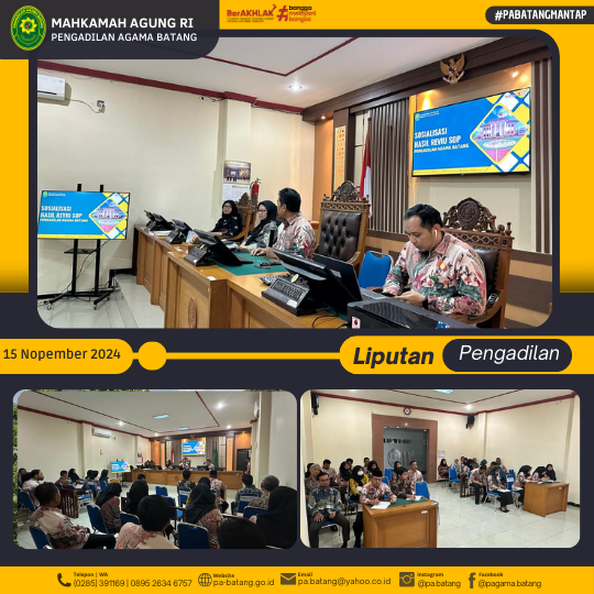 Batang, 15 Nopember 2024, Pengadilan Agama Batang kembali menunjukkan komitmennya dalam membangun integritas kinerja untuk meningkatkan kualitas pelayanan publik melalui kegiatan sosialisasi reviu Standar Operasional Prosedur (SOP) tahun 2024 yang berlangsung pada Jumat siang. Acara yang diselenggarakan di Ruang Sidang Utama PA Batang ini dihadiri oleh seluruh Aparatur, termasuk Hakim, Panitera, dan Sekretaris serta seluruh Pegawai PA Batang.
