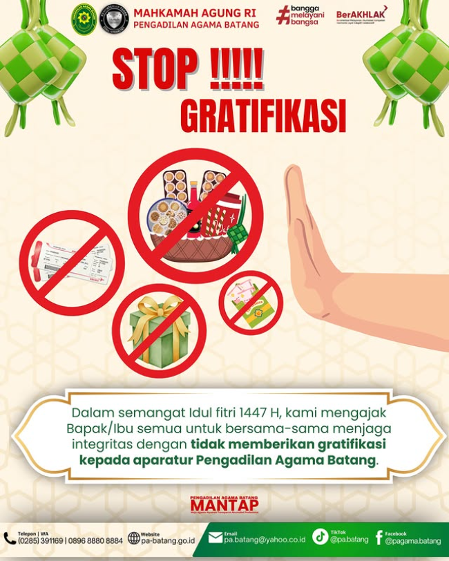 Dalam suasana Hari Raya Idulfitri, Pengadilan Agama Batang mengajak seluruh masyarakat untuk bersama-sama menjaga integritas dengan tidak memberikan gratifikasi kepada aparatur Pengadilan Agama Batang dalam bentuk apa pun. Dukungan dan pengertian dari masyarakat menjadi bagian penting dalam mewujudkan pelayanan publik yang bersih, transparan, dan terpercaya.