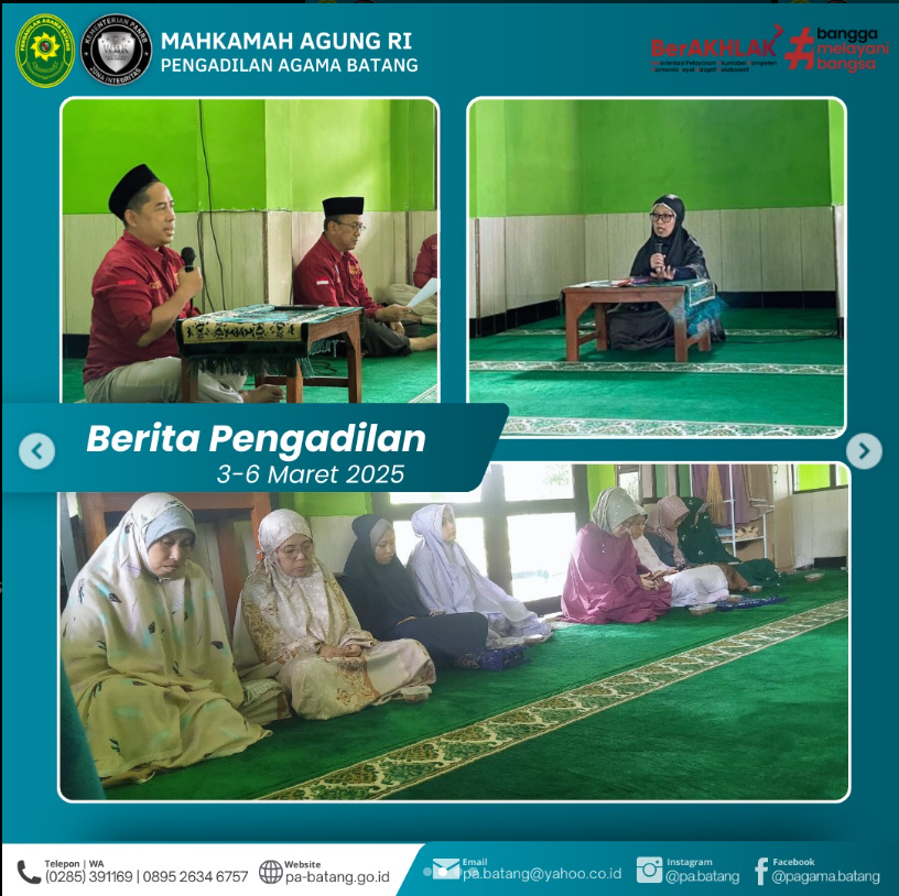 Batang, Maret 2025 – Dalam rangka menyemarakkan bulan suci Ramadhan 1446 H, seluruh Hakim dan Aparatur Pengadilan Agama Batang mengikuti kegiatan Tadarus Al-Qur’an dan Kultum Amaliah Ramadhan, yang berlangsung di Mushola Baitul Qisth PA Batang.