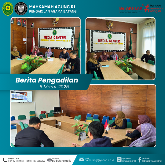 BATANG, Rabu 5 Maret 2025 Sesuai dengan surat dari Badan Peradilan Agama Nomor : 538/DJA/HM1.1.1/III/2025 tanggal 3 Maret 2025 tentang Undangan Mengikuti Pencanangan Sistem Manajemen Anti Penyuapan (SMAP) Secara Daring, Wakil Ketua, Hj. Lia Auliyah, S.H.I., M.H., Bersama Hakim, Panitera dan Sekretaris PA Batang mengikuti kegiatan tersebut di ruang Media Center PA Batang.
