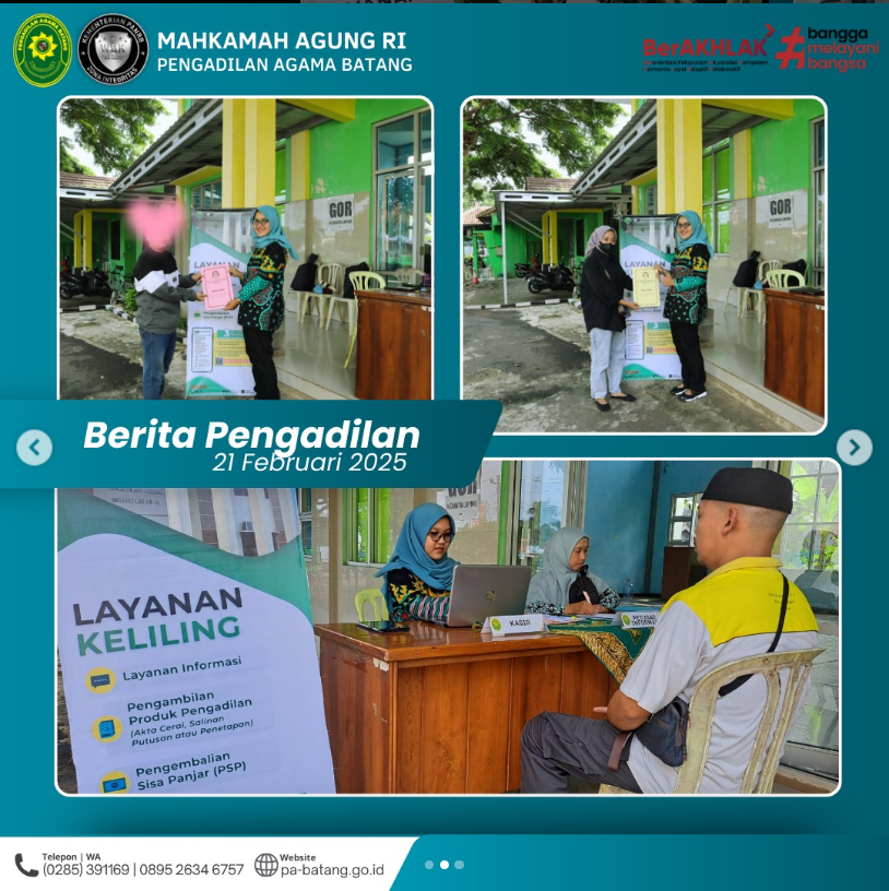 BATANG – Untuk kali kedua, Pengadilan Agama (PA) Batang kembali melaksanakan Sidang di Luar Gedung dan Layanan Keliling yang bertempat di Kecamatan Limpung, pada hari Jumat, 21 Februari 2025. Kegiatan ini merupakan salah satu upaya PA Batang dalam memberikan pelayanan hukum yang lebih dekat dan mudah diakses oleh masyarakat, terutama bagi mereka yang mengalami kendala jarak dan biaya untuk datang langsung ke kantor pengadilan.