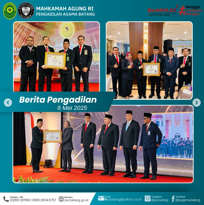 JAKARTA – Selasa, 6 Mei 2025 menjadi momen bersejarah bagi Pengadilan Agama Batang. Bertempat di Balairung Mahkamah Agung Republik Indonesia, Ketua PA Batang, Ikin, S.Ag., didampingi oleh Sekretaris dan Pranata Komputer menghadiri acara prestisius: Penyerahan dan Penganugerahan Piagam Penghargaan bagi Unit Kerja Berprestasi di Lingkungan Mahkamah Agung dan Badan Peradilan di Bawahnya.
