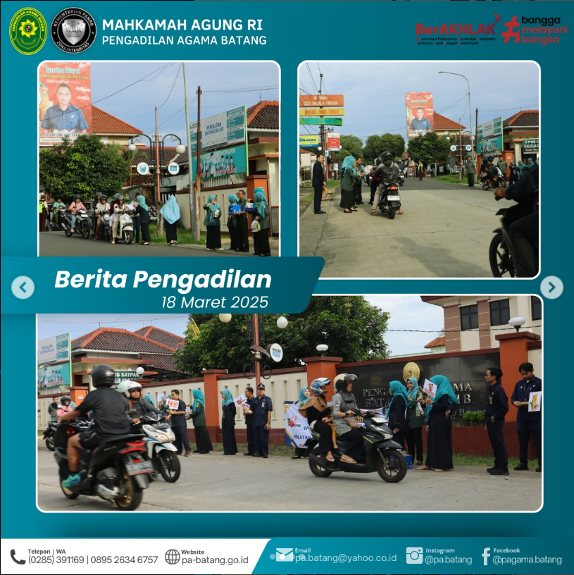 Batang, 18 Maret 2025 – Ada yang berbeda di depan Kantor Pengadilan Agama (PA) Batang hari ini! Para pegawai turun langsung ke jalan menggelar Public Campaign antikorupsi, sekaligus membagikan takjil kepada para pengendara yang melintas. Aksi ini tidak hanya sekadar berbagi makanan buka puasa, tetapi juga menyebarkan pesan moral penting tentang integritas dan kejujuran dalam kehidupan sehari-hari!
