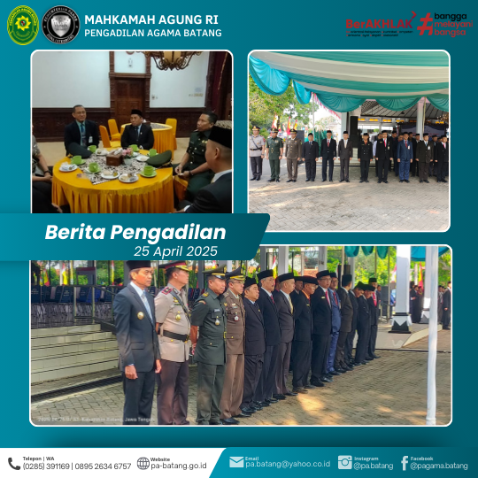 BATANG — Jumat, 25 April 2025, Ketua Pengadilan Agama Batang, Ikin, S.Ag., menghadiri Upacara Peringatan Hari Otonomi Daerah ke-XXIX Tahun 2025 yang diselenggarakan oleh Pemerintah Kabupaten Batang. Kegiatan berlangsung khidmat di Halaman Pendopo Kabupaten Batang, dimulai pukul 07.30 WIB.