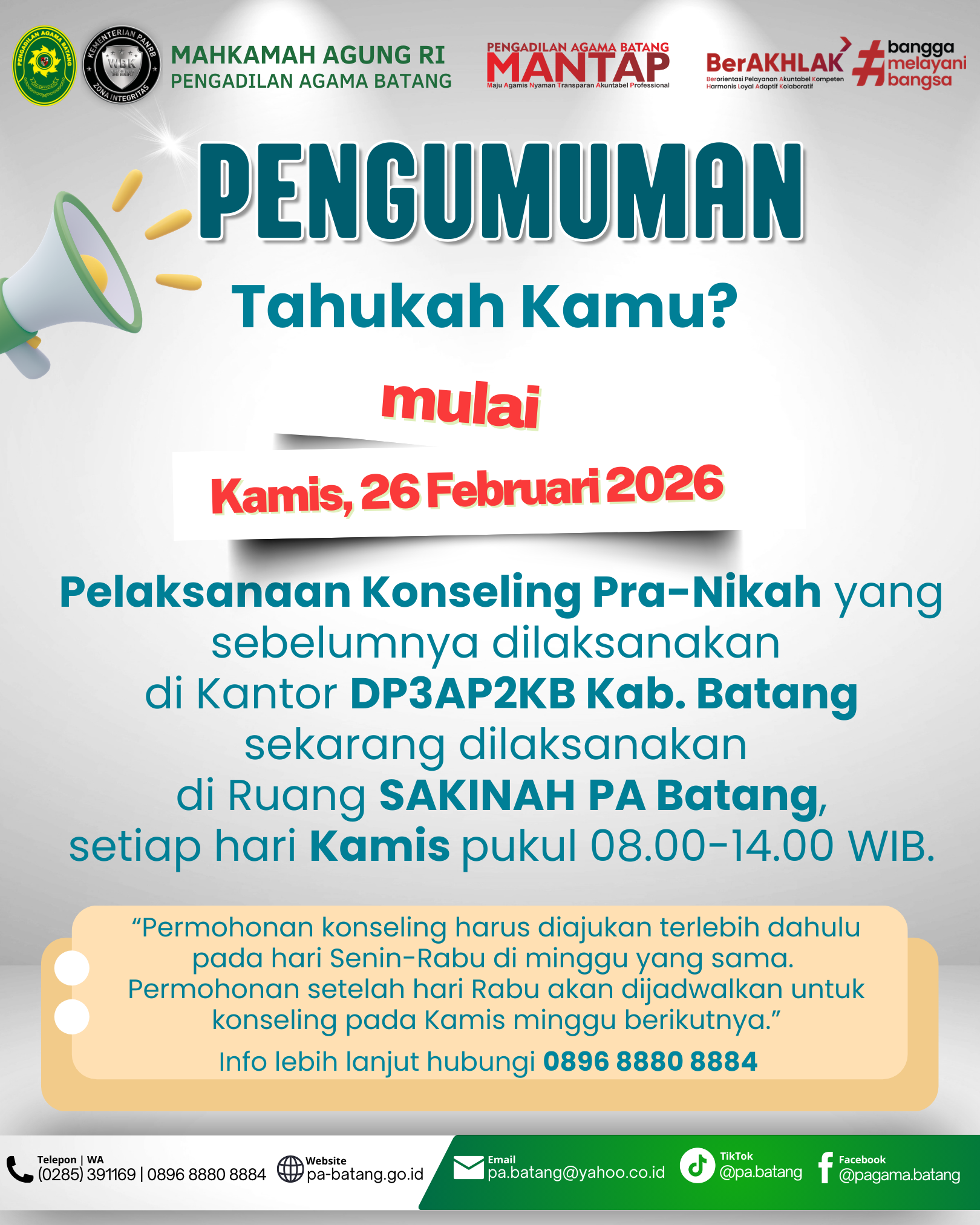 Mulai Kamis, 26 Februari 2026, pelaksanaan Konseling Pra-Nikah yang sebelumnya dilaksanakan di Kantor DP3AP2KB Kab. Batang kini dilaksanakan di Ruang SAKINAH PA Batang.