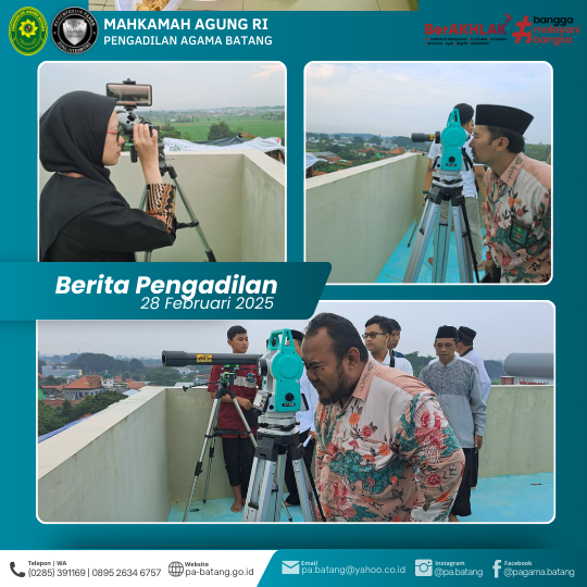 Batang, 28 Februari 2025 – Pengadilan Agama Batang menggelar Sidang Kesaksian Rukyat Hilal pada Jumat (28/2) di Rooftop Gedung Rifa’iyah, Kabupaten Batang. Sidang ini diselenggarakan berdasarkan permohonan dari Kementerian Agama Kabupaten Batang.