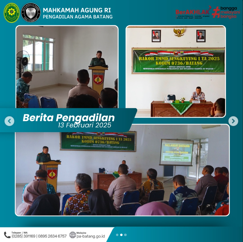 BATANG – Panitera Muda Gugatan Pengadilan Agama Batang, Eko Kusdiyanto, S.H., hadir mewakili pimpinan dalam Rapat Koordinasi Persiapan Pelaksanaan TNI Manunggal Membangun Desa (TMMD) Sengkuyung I Tahun Anggaran 2025. Acara tersebut berlangsung di Aula Makodim 0736/Batang pada Rabu pagi (13/2/2025).