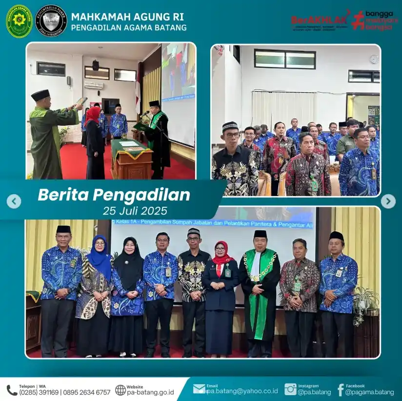 Pemalang, 25 Juli 2025 – Bertempat di Ruang Sidang Abu Bakar As Shidiq Pengadilan Agama Pemalang, Ketua Pengadilan Agama Batang bersama rombongan menghadiri acara Pengambilan Sumpah Jabatan dan Pelantikan Panitera atas nama Sri Paryani Sulistyowati, S.Ag., pada hari Jumat, 25 Juli 2025 pukul 09.00 WIB.
