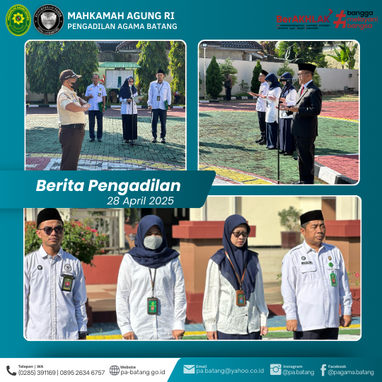 BATANG – Senin, 28 April 2025, tepat pukul 08.00 WIB, halaman Pengadilan Agama Batang dipenuhi semangat baru saat Pimpinan, Hakim, Pejabat Struktural dan Fungsional, Staf, serta PPNPN melaksanakan Apel Pagi sebagai pembuka rutinitas kerja selama sepekan ke depan.