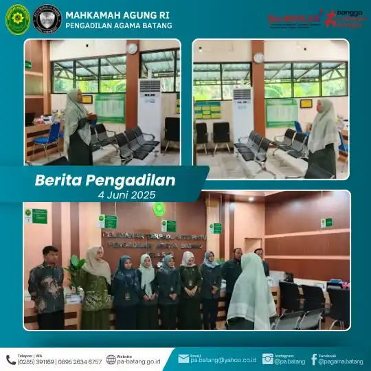 BATANG – Rabu, 4 Juni 2025, tepat pukul 08.00 WIB, Petugas Pelayanan Terpadu Satu Pintu (PTSP) dan Petugas Pos Bantuan Hukum (Posbakum) dari LBH Fasya UIN KH. Abdurrahman Wahid Pekalongan yang bertugas di Pengadilan Agama Batang kembali mengikuti briefing rutin yang digelar di ruang PTSP PA Batang.