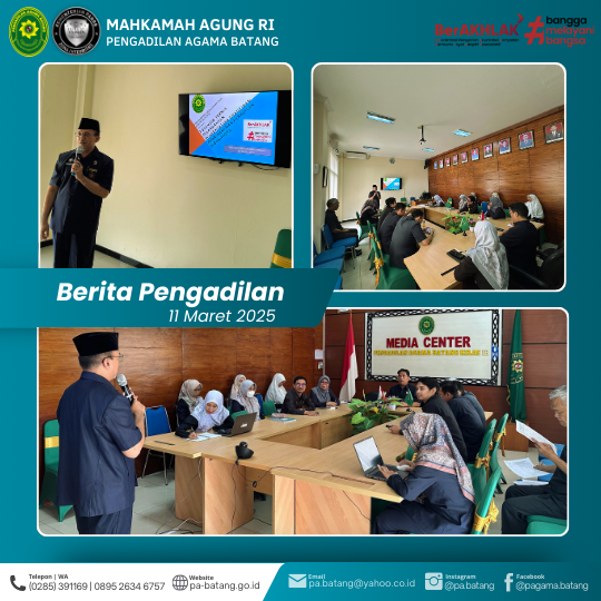 Batang, 11 Maret 2025 – Pengadilan Agama (PA) Batang semakin menunjukkan komitmennya dalam membangun peradilan yang bersih dan berintegritas. Pada hari Selasa (11/3), PA Batang menggelar sosialisasi dan public campaign internal mengenai Penanganan Gratifikasi di Media Center PA Batang.